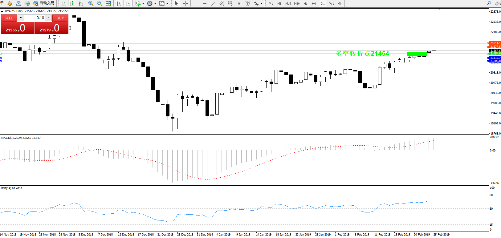 交易策略:21454上方看涨,目标21677、21811