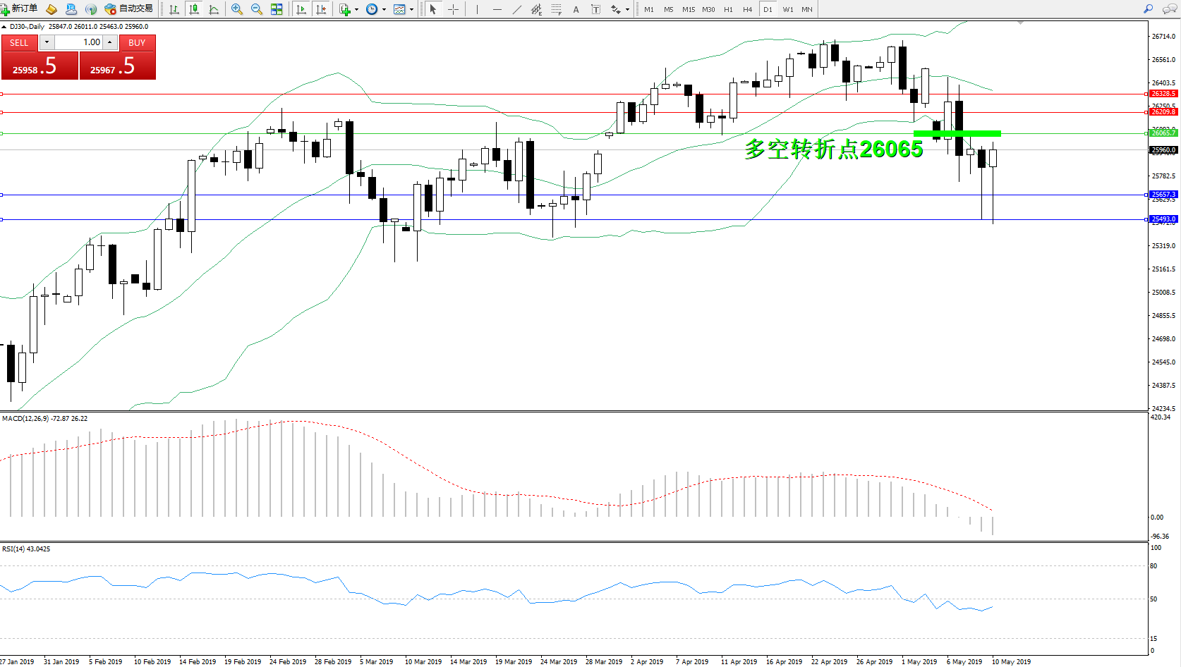 美国劳工部报告称,美国4月消费者物价指数(CPI)上升,但基本通胀保持温和,暗示美联储可能在一段时间内维持利率不变;此外,美国决定提高从中国进口商品的关税,引发了市场对美联储将在今年晚些时候降息的猜测。贸易争端加剧了人们对全球经济放缓的担忧,道琼斯指数收涨114.00点,涨幅0.44%,报25942.37点;美联储威廉姆斯:美国经济表现强劲,没有关于通胀压力的迹象,美国经济“形势非常好”,预计2019GDP将持续性地增长2.25%