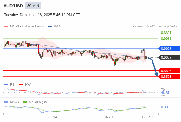 交易策略: 当 0.6657 维持阻力位时,存在回归 0.6595 的风险。