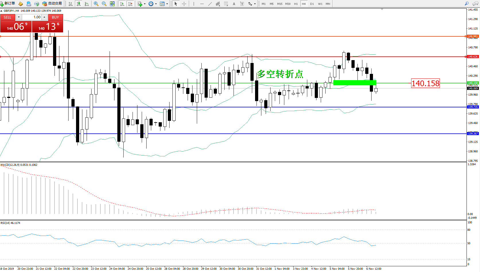 备选策略:140.158上方看涨,目标140.626、140.983
