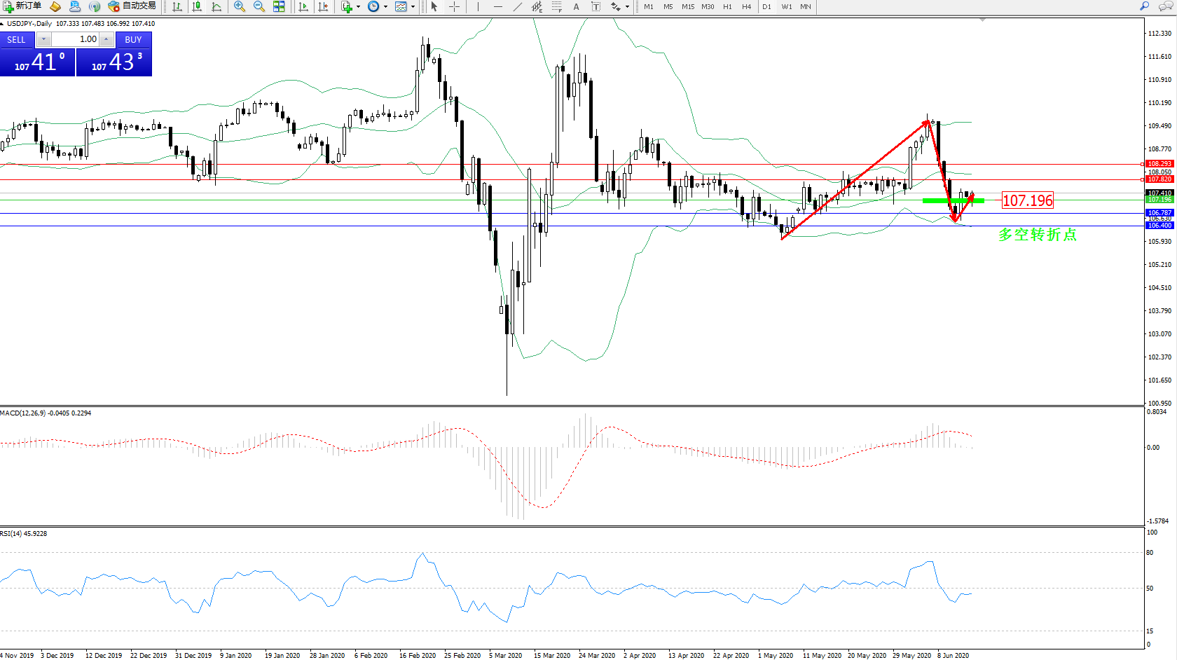 交易策略:107.196上方看涨,目标107.820、108.293