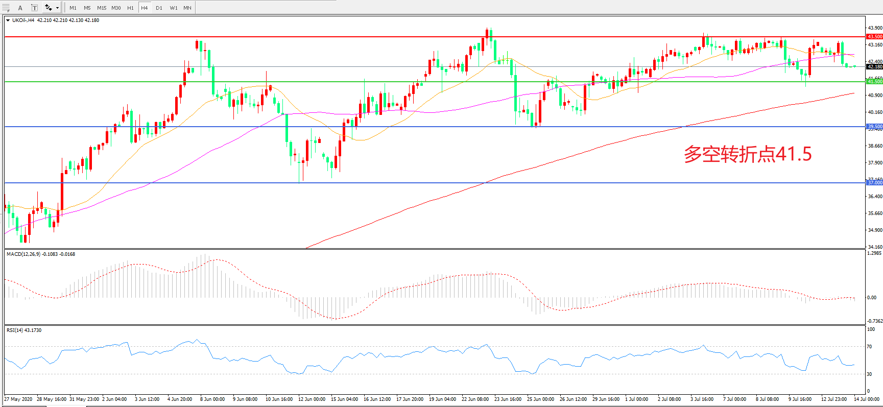 周一(7月13日),美国新冠确诊病例累计超过335万,疫情的蔓延引发对需求的担忧,布伦特原油震荡下行,收报42.15美元/桶。疫情二次蔓延叠加经济复苏停滞,使得原油需求前景依旧不明朗,疲弱的动能增加了油价继续受阻于43.5美元下方盘整,并可能深度回调的风险。