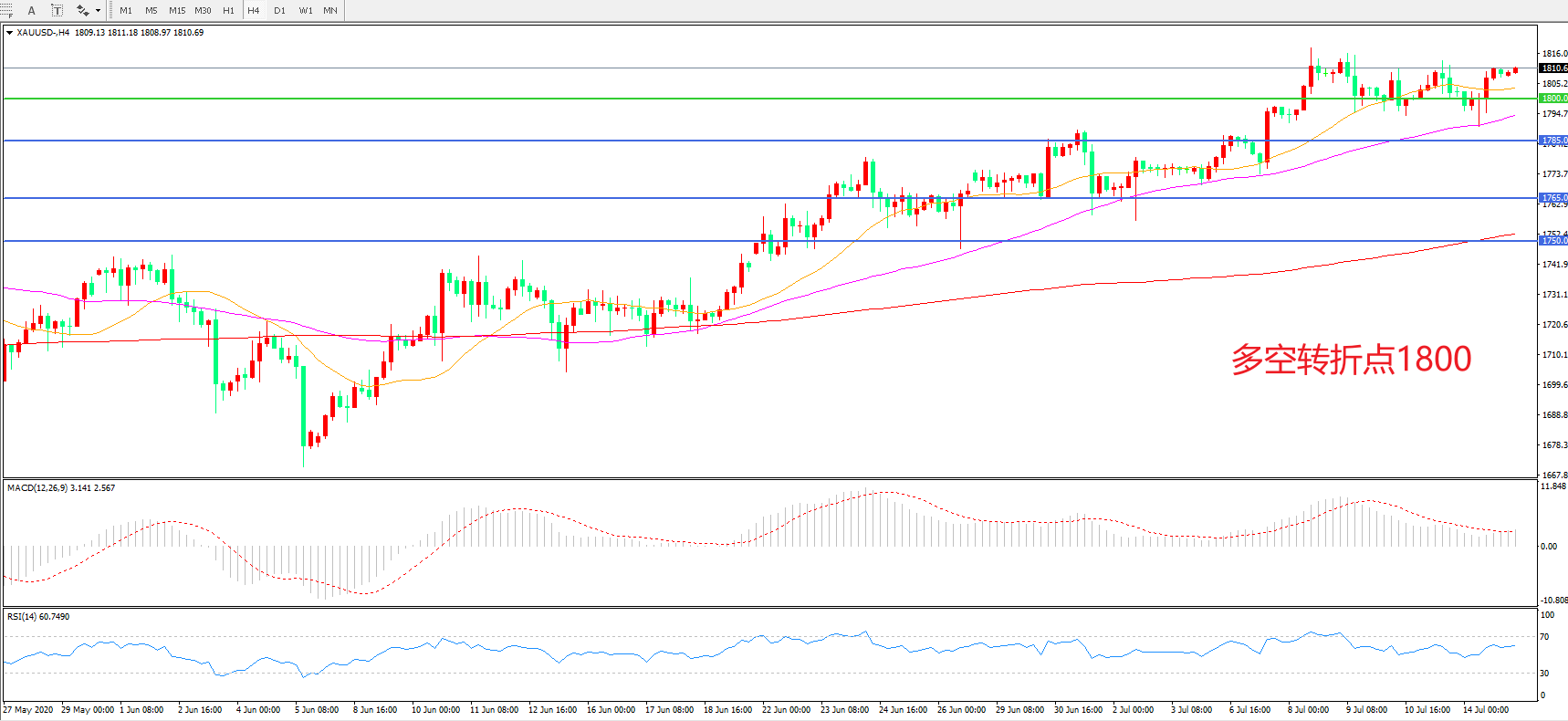 交易策略:在1800.00之上看涨,目标1820.00   1845.00