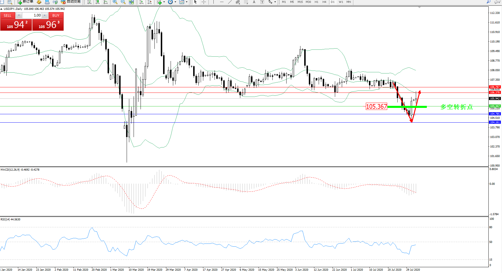 交易策略:105.367上方看涨,目标106.378、106.787