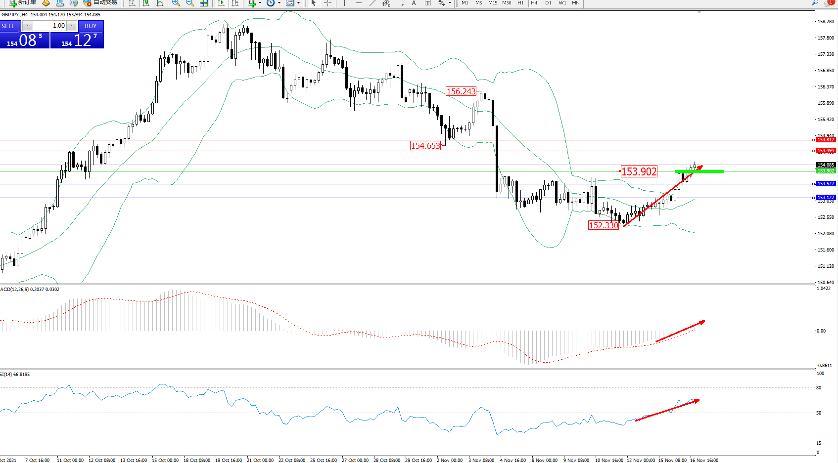交易策略:153.902上方看涨,目标154.494、154.812