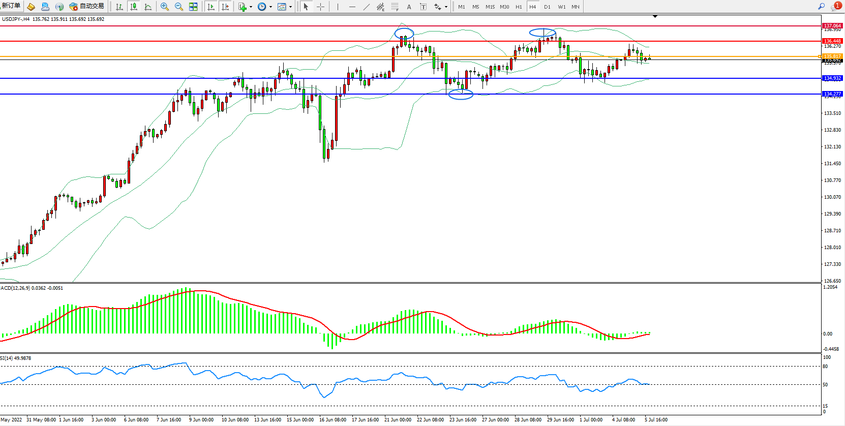 4小时图看:长时间处于高位维持区间震荡,布林带指标呈收口走势持续平移中,MACD指标处于0轴线附近弱势徘徊,RSI指标处于50均衡线附近窄幅整理;