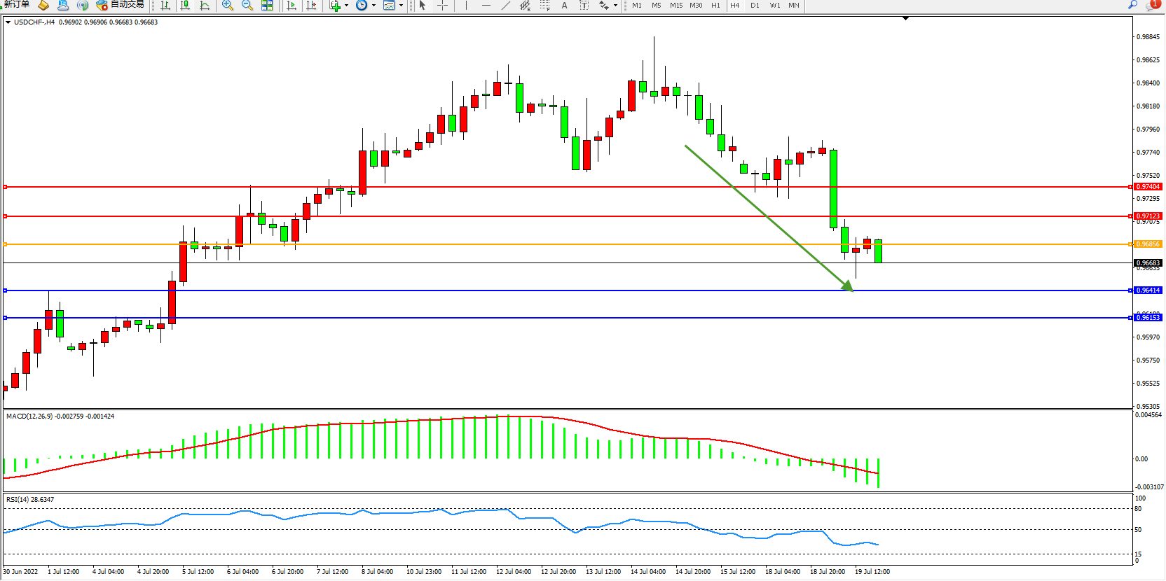 交易策略:0.96856下方看跌,目标0.96414、0.96153