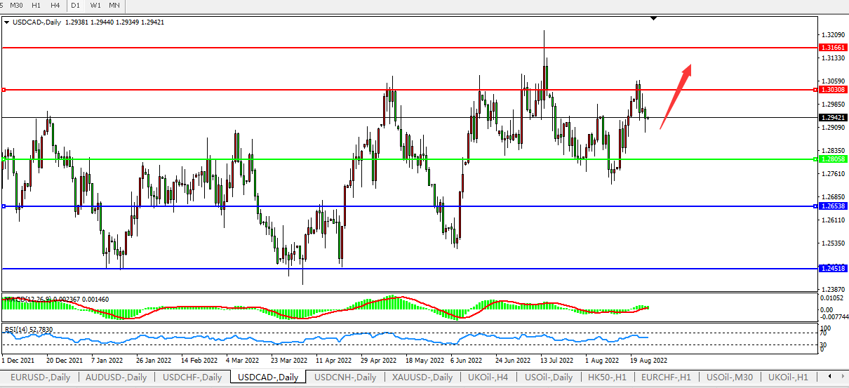日线图看:短期汇价再度下行,MACD运行于0轴上且量能0轴上开始缩量,RSI整理下行,预计短期汇价大概率将在回测整理后进一步上行。