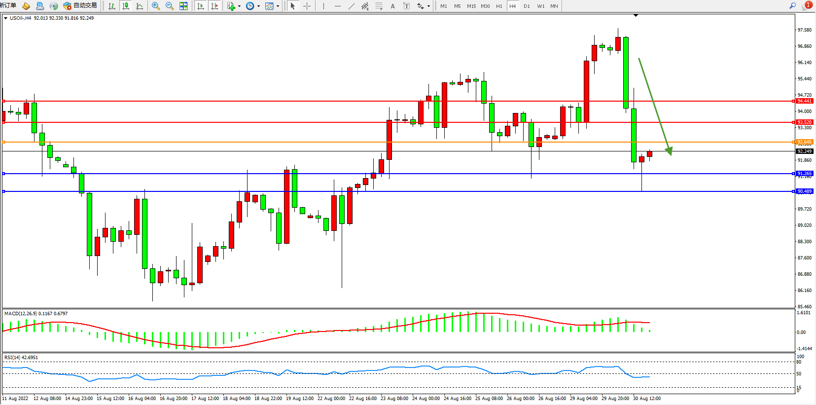 交易策略:92.645下方看跌,目标91.265、90.489