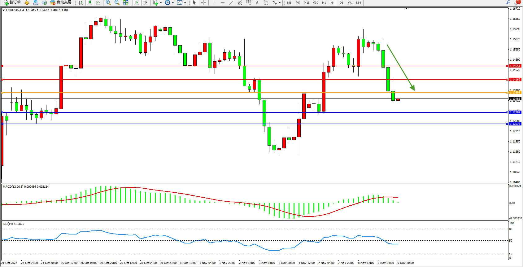 交易策略:1.13695下方看跌,目标1.12984、1.12573