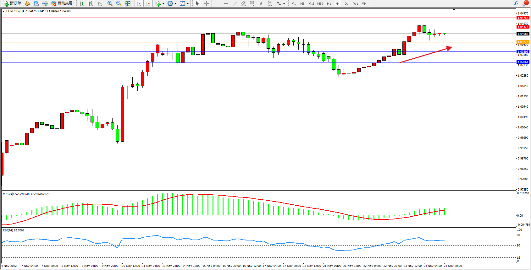 交易策略:1.03723上方看涨,目标1.04374、1.04767