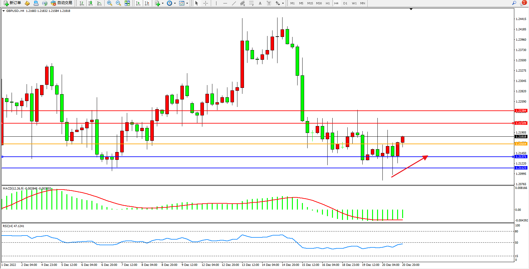 交易策略:1.21654上方看涨,目标1.22109、1.22384