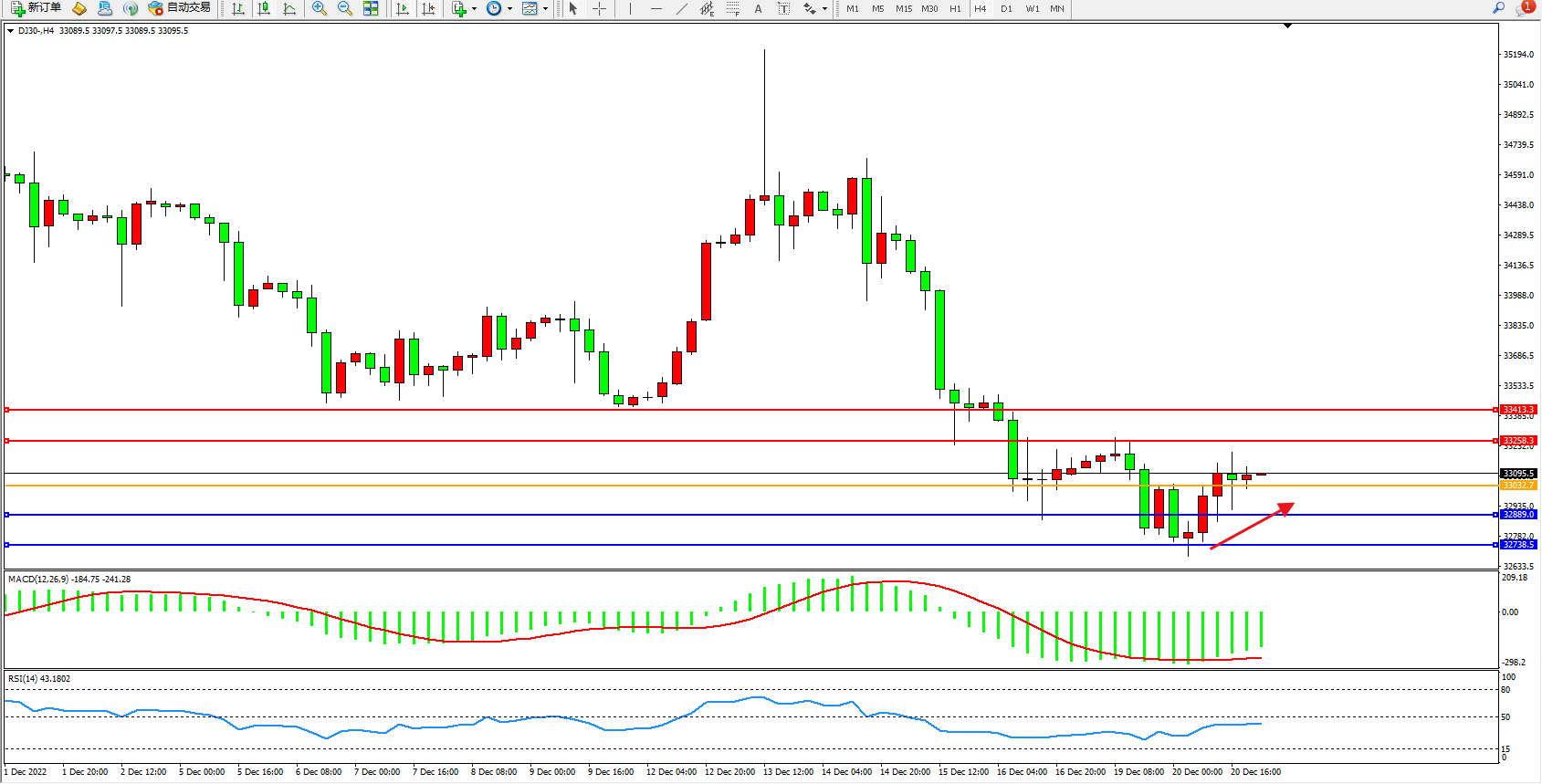 道琼斯指数DJ30——4小时K线图显示: