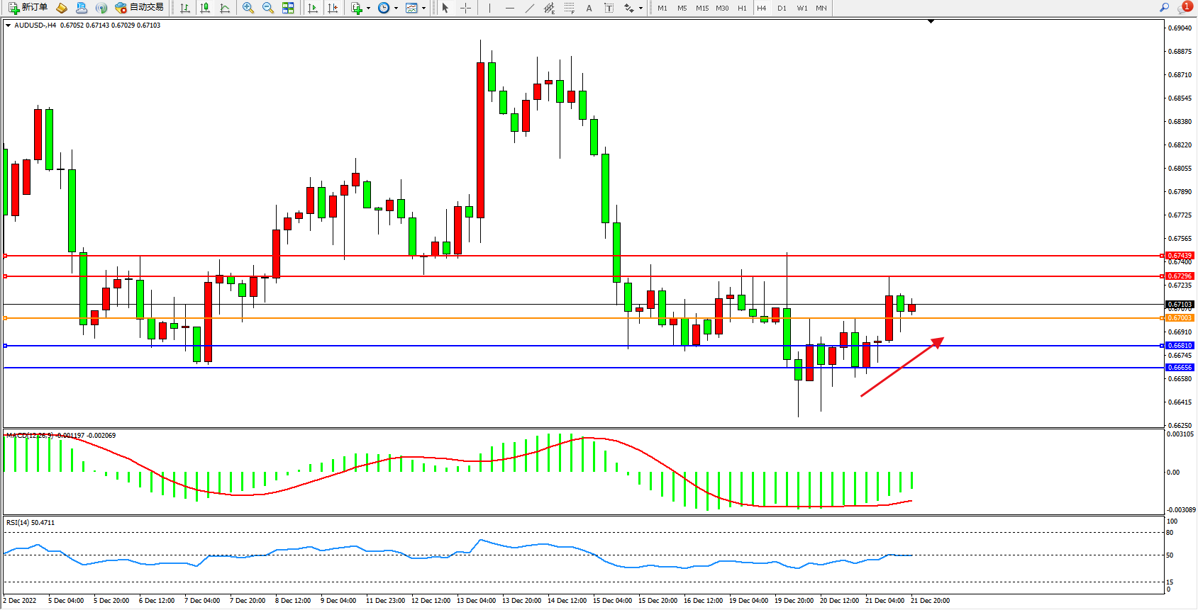 交易策略:0.67003上方看涨,目标0.67296、0.67439