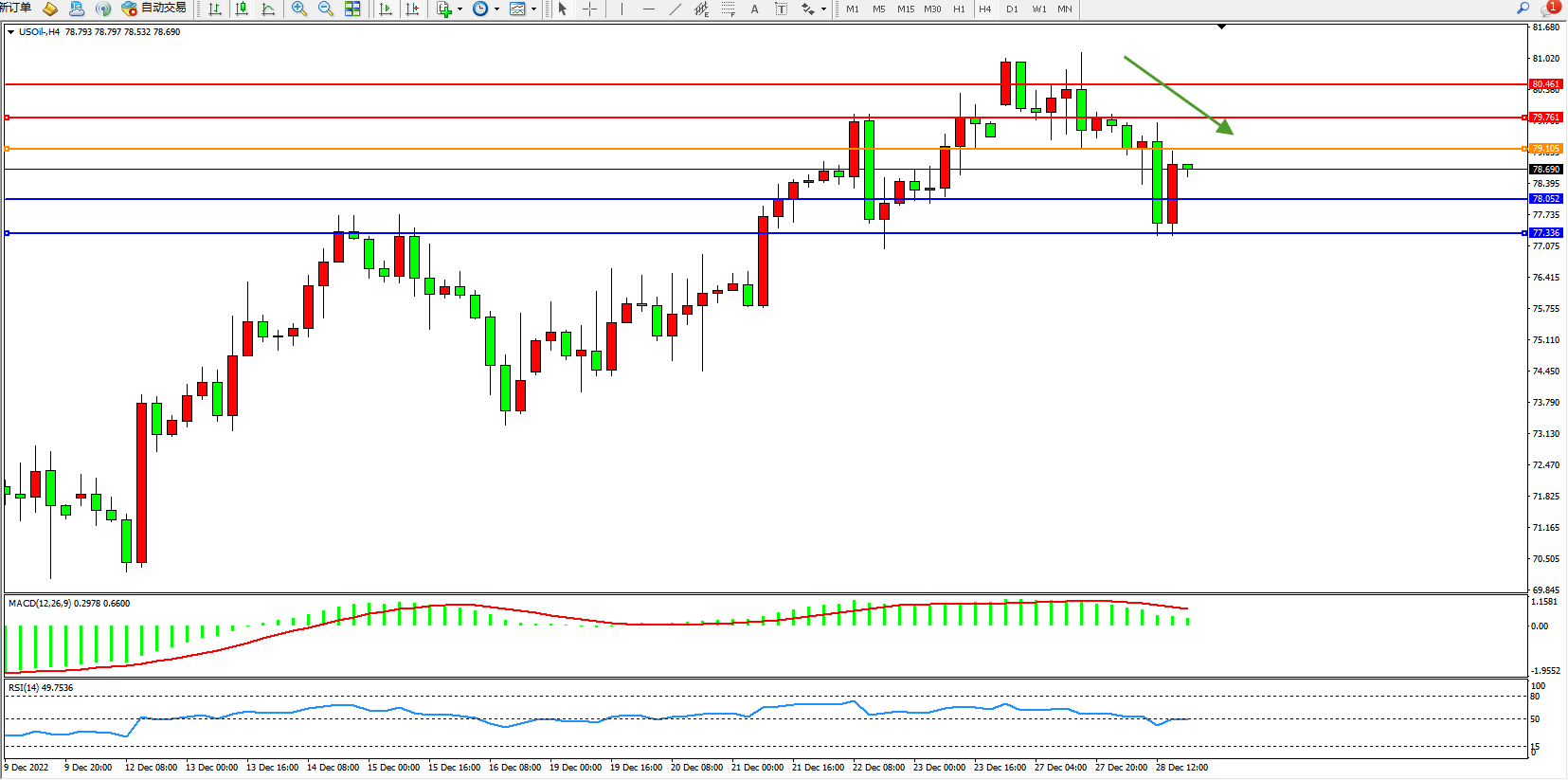 原油维持78.690附近震荡,全球经济复苏前景不佳料限制燃料需求增长。虽然俄罗斯对部分国家禁售石油,但有可能被2023年全球经济衰退可能导致的需求下降所抵消。
