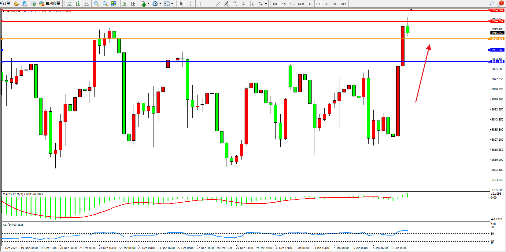 标普SP500——4小时K线图显示: