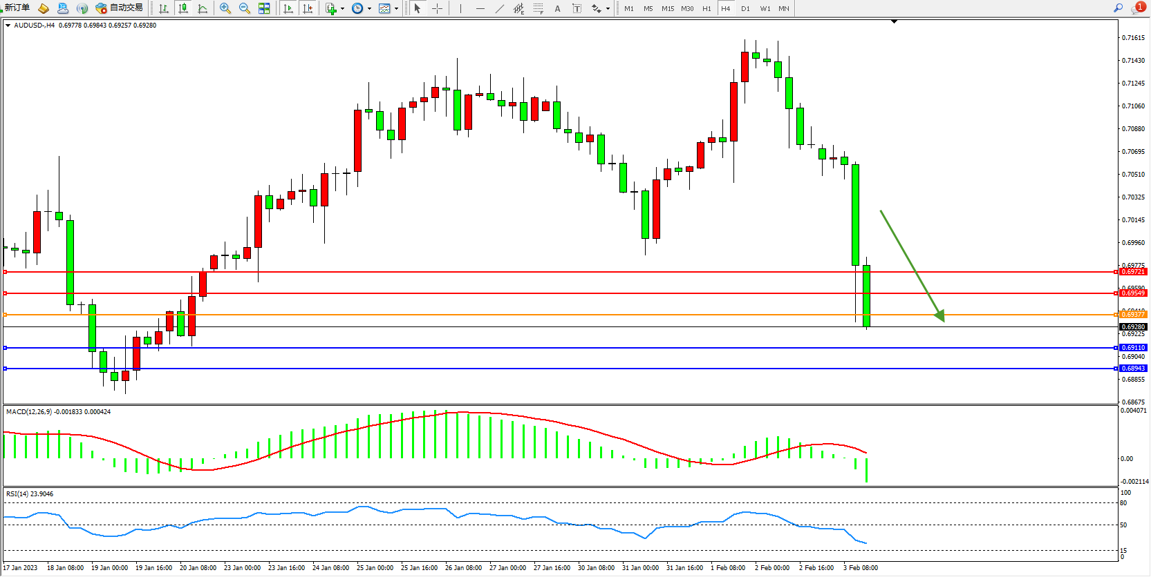 交易策略:0.69377下方看跌,目标0.69110、0.68943