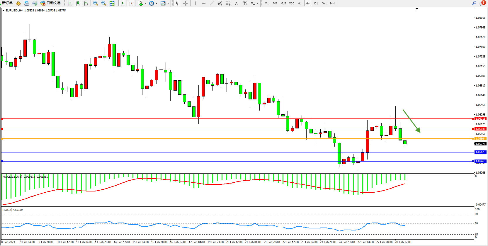 交易策略:1.05864下方看跌,目标1.05623、1.05463