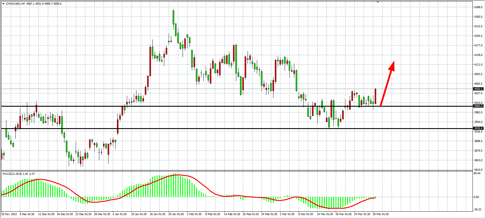 4小时图看,沪深300在400之上尾盘走高,MACD能量上穿零轴,同时整理区间上破,当前4000确认强支撑,该位之上看涨4100-4150附近。