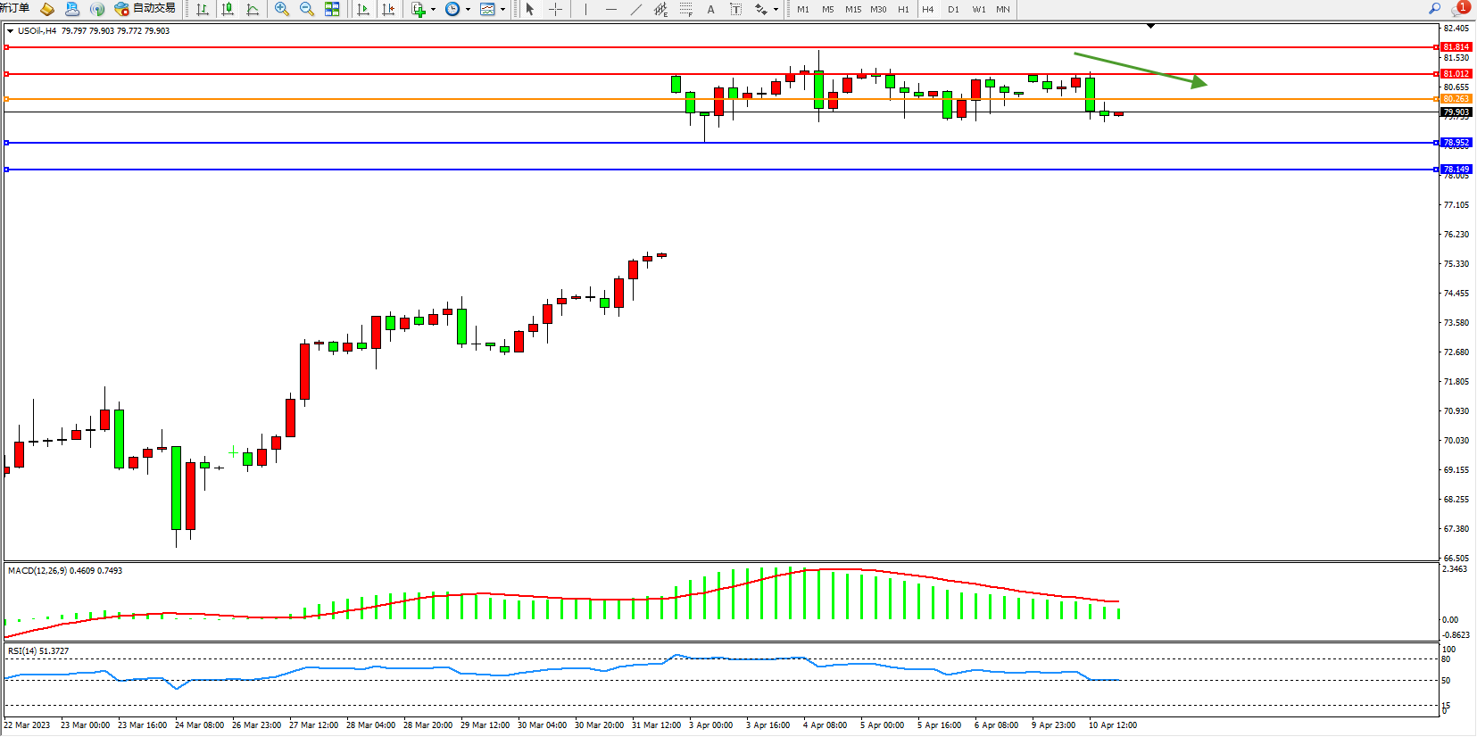 4小时图看:高位短期窄幅弱势整理,市场空头情绪开始有缓慢涌现迹象,MACD指标处于多头区域维持整理下移,RSI指标处于50均衡线附近弱势徘徊;
