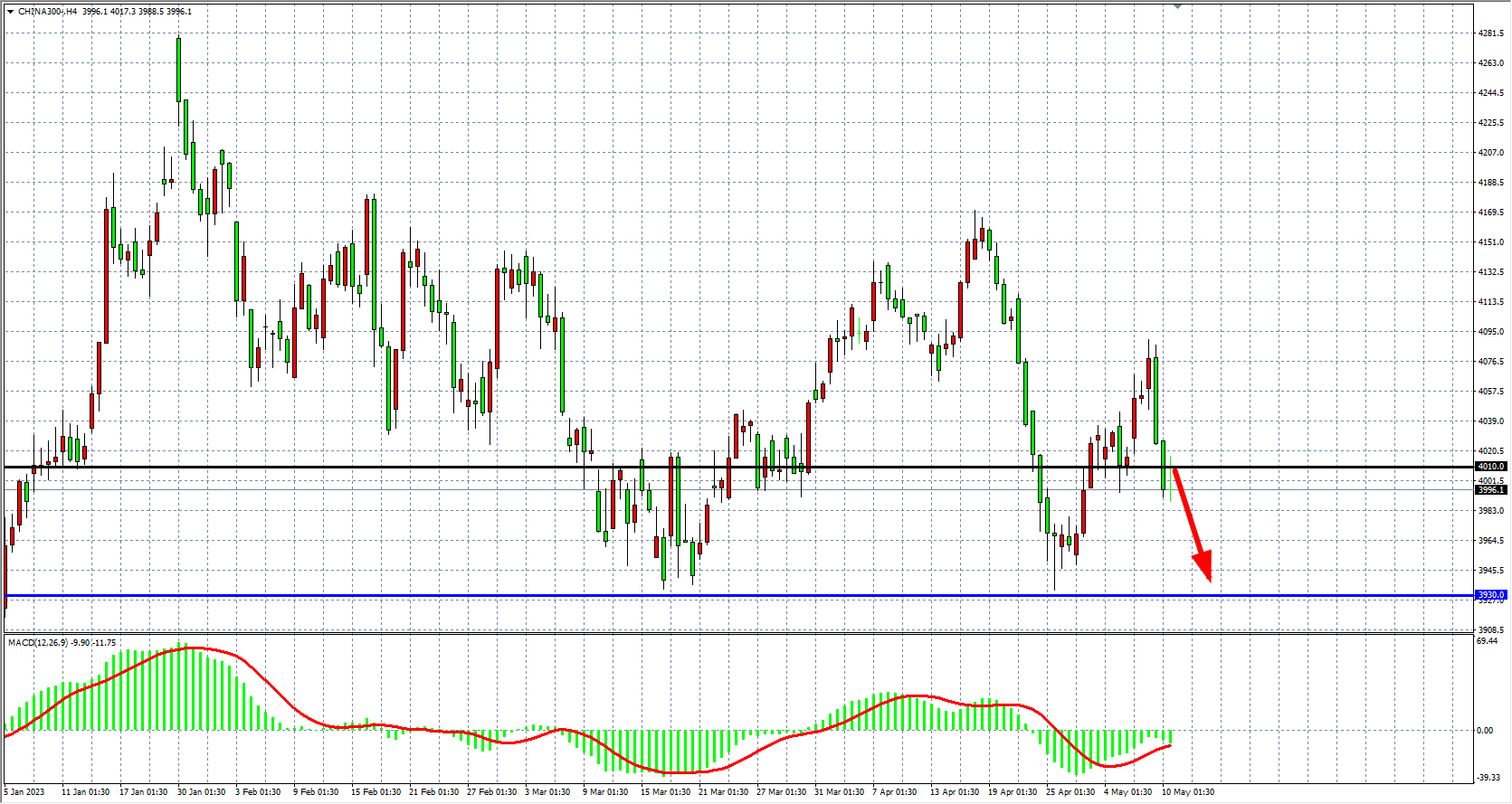 4小时图看,沪深300进一步回落下破4000点,短期趋势走弱,MACD量能在零轴下有所放量,多头存在回调压力,当前支撑4010已转化为压力,该位之下继续看跌,目标3960-3930附近