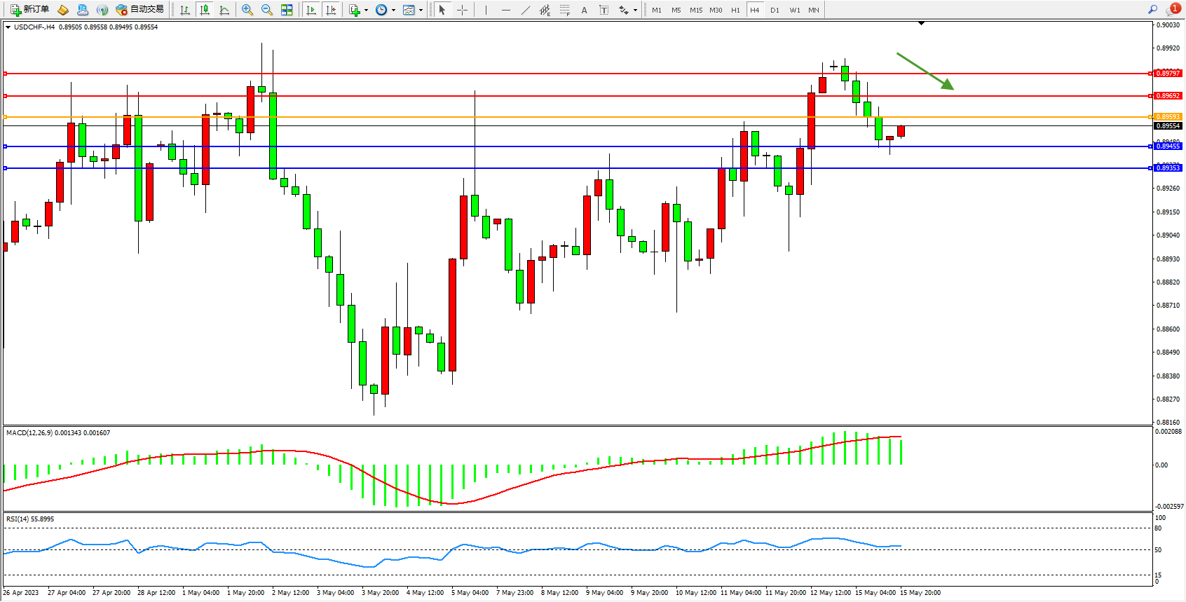 美元瑞郎USDCHF——4小时K线图显示: