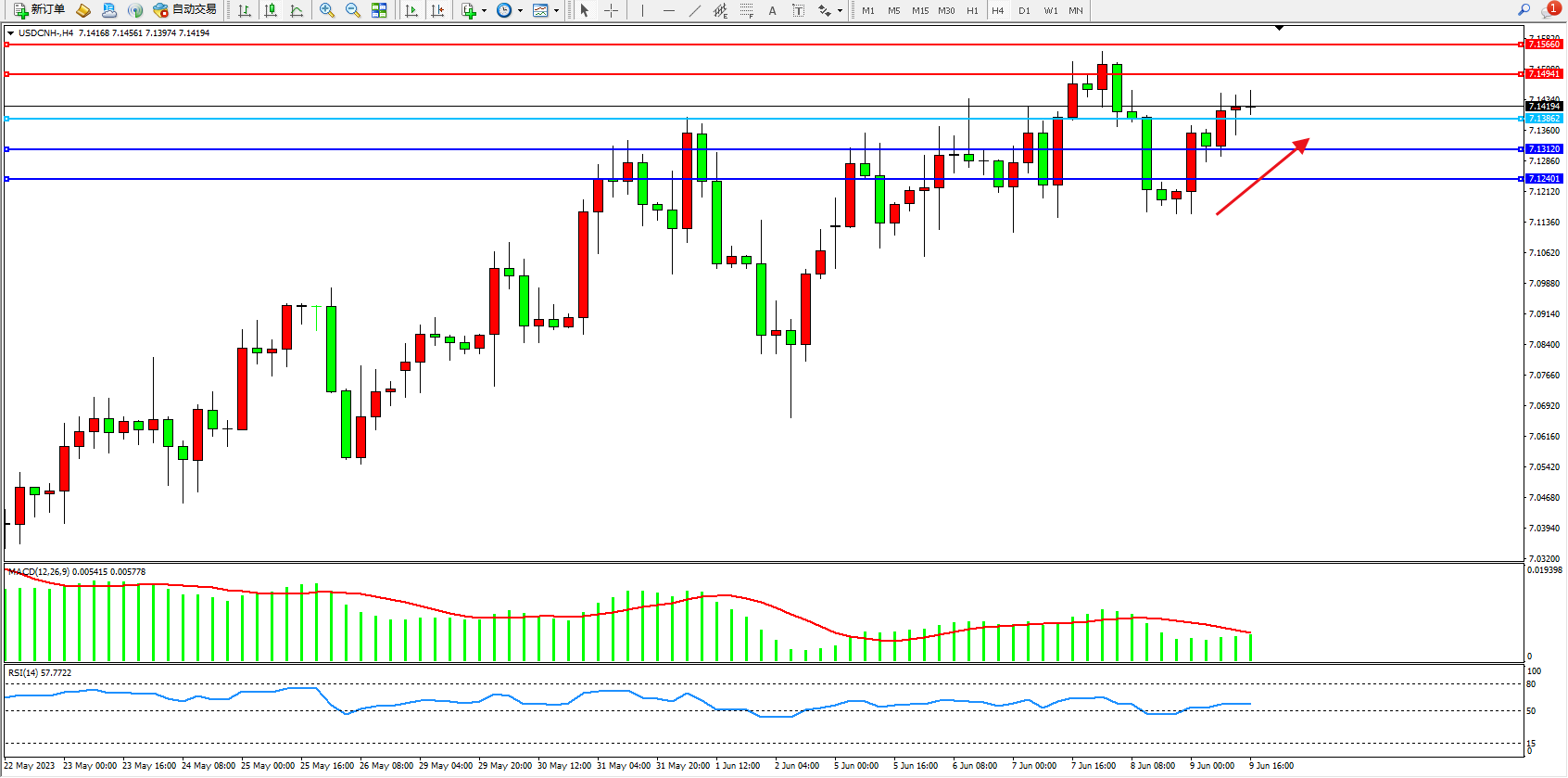 交易策略:7.13862下方看跌,目标7.13120  7.12401