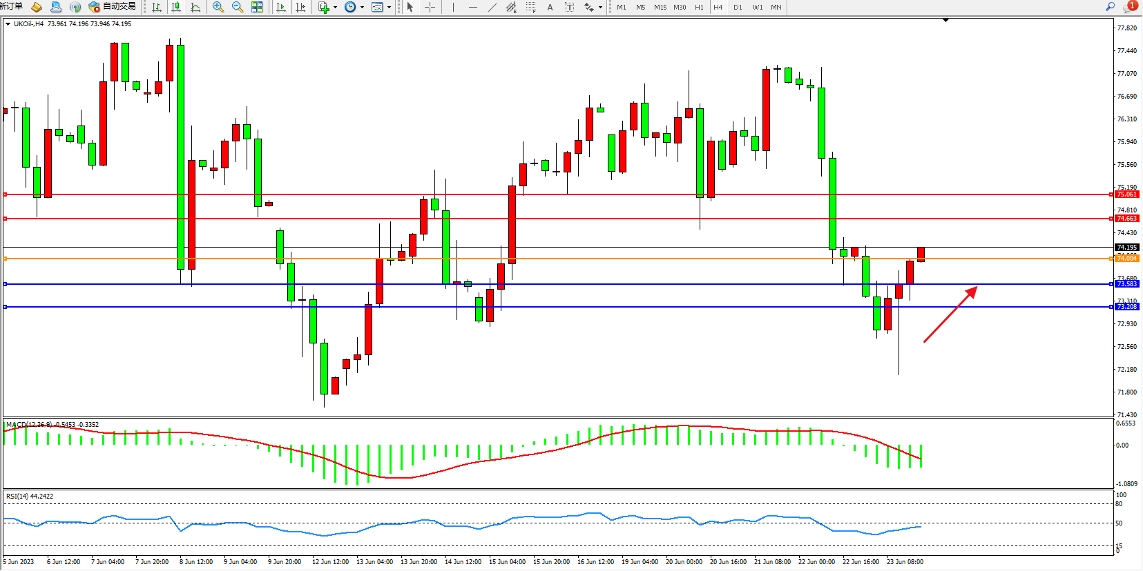 交易策略:74.004上方看涨,目标74.663 75.061