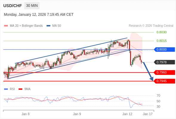 在 0.8000 之下,看跌,目标价位为 0.7960 ,然后为 0.7945 。