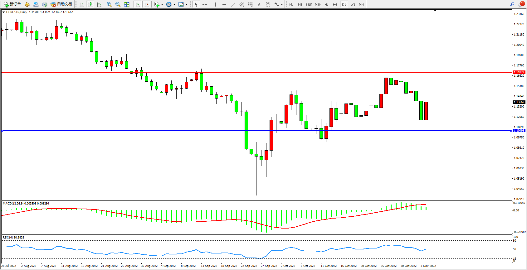 短期震荡上移后遇阻回撤,市场空头动力开始浮现,但下行动力有所欠缺,上方压制关注1.18972附近,低位支撑关注1.10495附近,MACD指标处于0轴线上侧徘徊,RSI指标处于50均衡线附近震荡,如图: