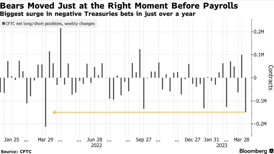 据美国商品期货交易委员会(CFTC)的最新报告显示,在截至上周二的一周内,杠杆基金美国10年期国债期货的净空头头寸攀升了近15万份合约,这是自2022年3月以来最大的看跌转变。美国国债上周五大跌,此前3月美国就业数据提振了美联储将在5月初加息25个基点的预期。