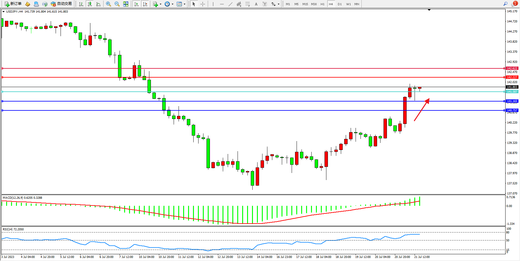 4小时图看:多头动力维持震荡上移,市场看涨情绪笼罩,短期有继续向上移动态势,MACD指标处于多头区域不断上移,RSI指标处于多头区域高位整理;