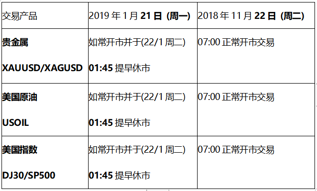 由于美国马丁路德金纪念日假期 (20191月21日周),以下部分交易产品的交易时间将受美国假期休市影响,敬请阁下留意知悉!